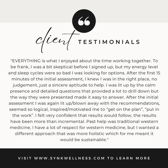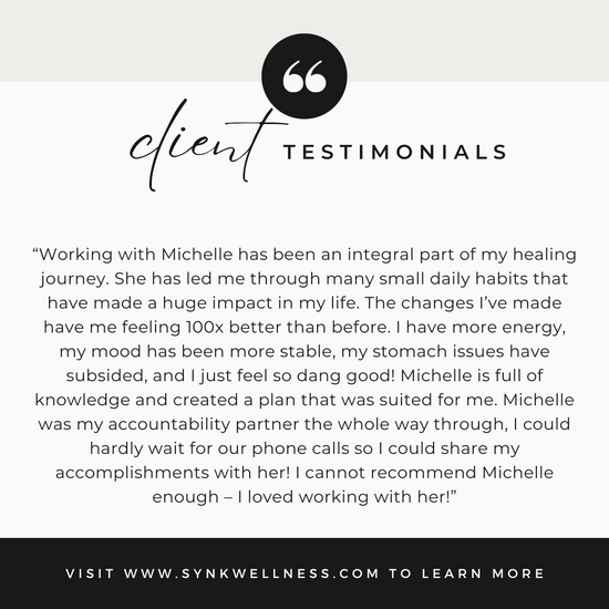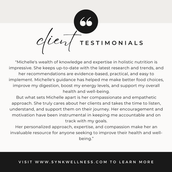 During our SyNK Sessions, Michelle will work closely with you to understand your individual goals and challenges. She will carefully assess where you are currently, offer support and education (especially in debunking THE MANY "shoulds" and "should nots" of the overwhelming Wellness industry) and develop a personalized plan tailored to your specific needs.